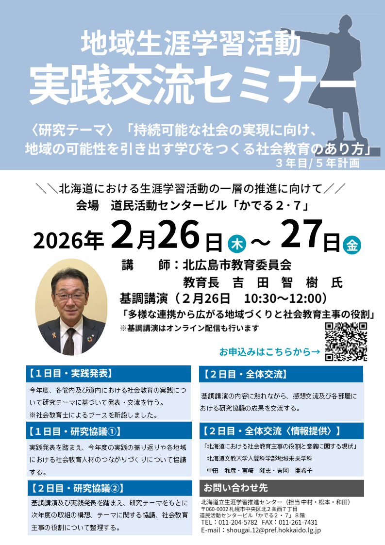- 概要: 北海道における生涯学習活動の一層の推進を図るため、実践事例等の交流を通して、これまでの生涯学習推進上の成果や課題を共有し、次年度の取組について具体的な方策を明らかにする。