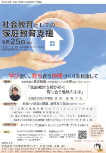 - 概要: 社会教育として子どもの成長や学びを地域全体で支援していくために、「家庭教育」に関する基礎的な内容を学び、保護者の現状に寄り添った活動事例から家庭及び地域住民その他の関係者の連携及び促進の仕方について理解を深める。